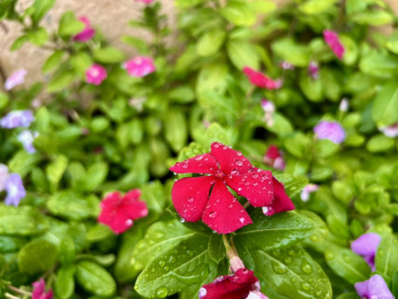 雨粒を乗せても凛としている赤い日々草が、晴れやかな気持ちにさせてくれました。